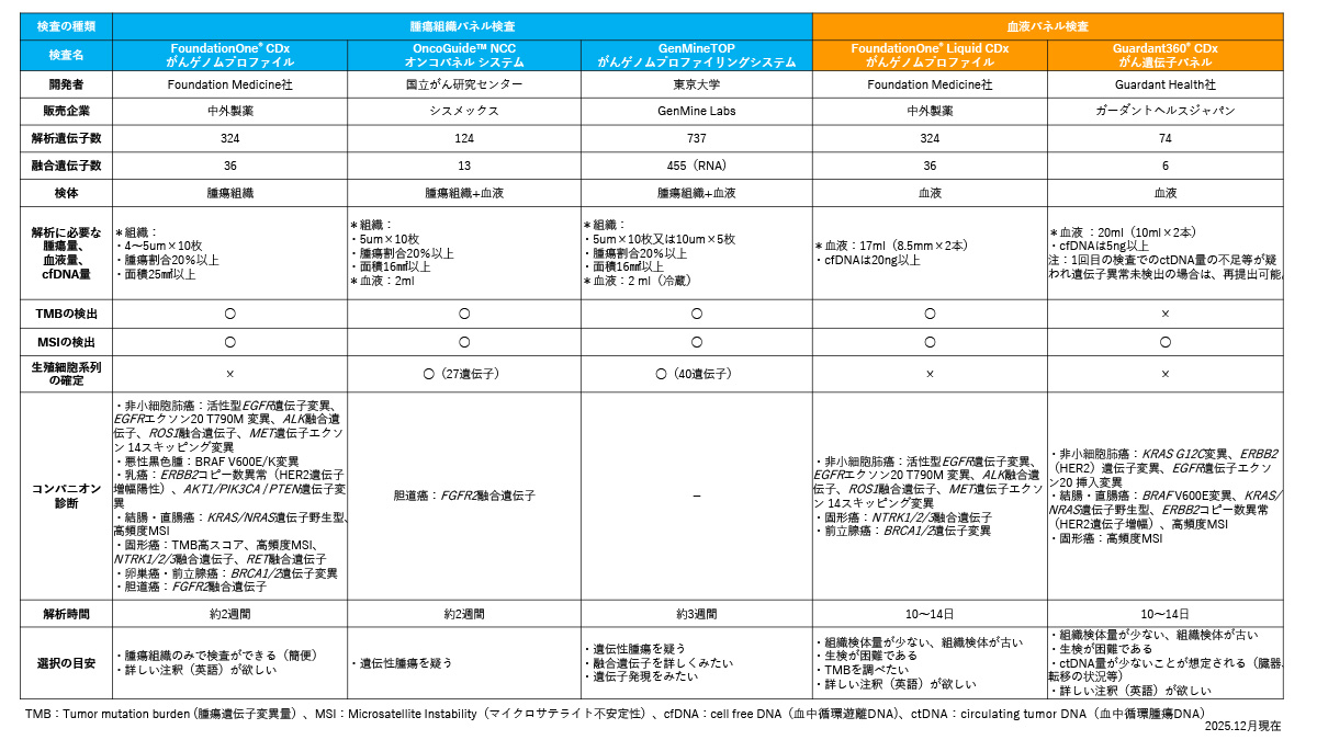 保険診療のがん遺伝子パネル検査では、組織検体を用いた検査(NCC オンコパネル・FoundationOne CDx・GenMineTOP)が優先され、血液を用いた検査(FoundationOne Liquid CDx・Guardant360 CDx)は、医学的理由で組織検体検査が困難な場合や組織検体を用いた検