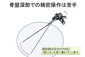 しかし、腹腔鏡にも弱点があります。自分の目となるカメラを助手の医師がコントロールするため、自分が見たいところが見えないことがあります。また、真っ直ぐの棒のようなデバイスを用いて手術するため、からだの奥に行くに従ってコントロールが困難になり、その結果がんを取りこぼしたり、まわりの神経などを傷つけやすくなります。