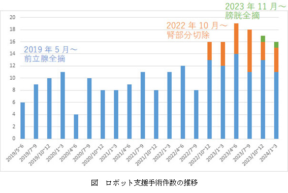 泌尿器科では、2019年5月からロボット支援前立腺全摘除術を開始し、2022年2月には100例を超えました。2022年10月には腎部分切除術、2023年11月には膀胱全摘除術を開始しました。膀胱全摘の際は、回腸導管もロボットで作成しております(体腔内回腸導管造設術ICUD)。件数は増加しており、2023年10月には総数が200例を超えました。