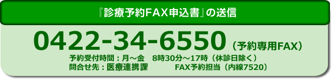 - FAX予約(0422-34-6550)に指定の予約フォームでお申し込みください。 (予約受付時間外でも24時間受信可)